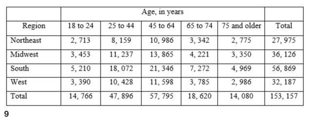 本题解析:According to the table, in 2012 there was a total of 14,766 + 47,896 = 62,662 registered voters between 18 and 44 years old, and 3,453 + 11,237 = 14,690 of them were from the Midwest region. Therefore, the probability that a randomly chosen registered voter who was between 18 and 44 years old in 2012 was from Midwest region is 1469062662≈0.2341469062662≈0.234. Of the given choices, 0.25 is closest to this value.
