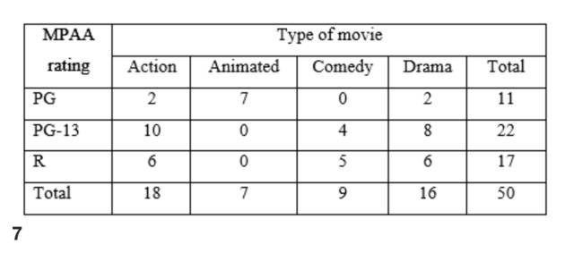 The table above represents the 50 movies that had the greatest ticket sales in 2012, categorized by movie type and Motion Picture Association of America (MPAA) rating. What proportion of the movies are comedies with a PG-13 rating?