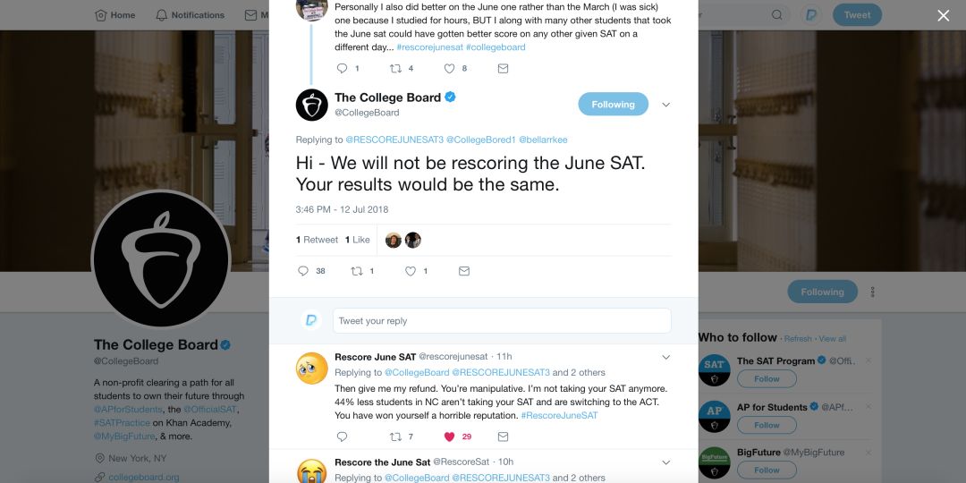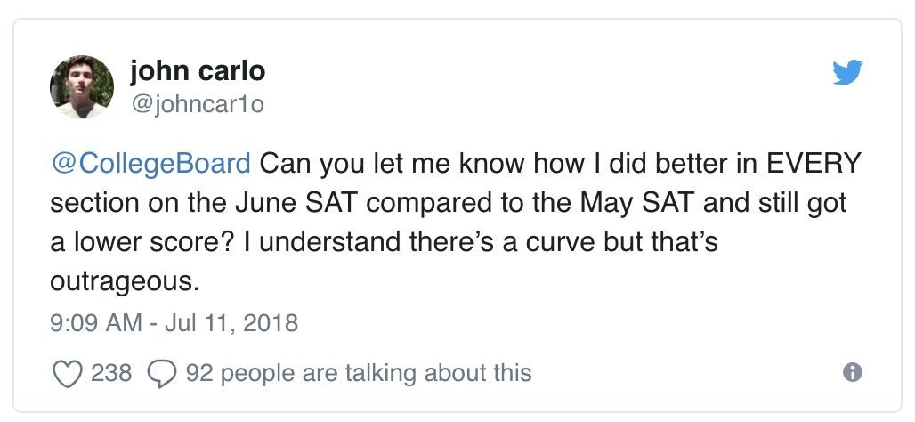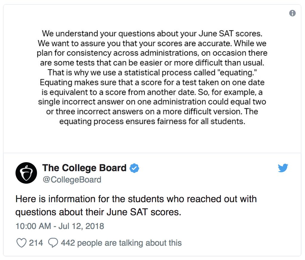 College Board回应六月SAT疑云! 资讯趣闻 今年上半年的SAT在6月2日落下帷幕,大量的考生在经历了这场“感觉上比较简单的”考试之后都安心进入Final和AP的准备。然而成绩公布之后,6月场的得分和对题数却让很多北美考生大跌眼镜甚至感到愤怒。 信息及截图来自youthradio.com 很多学生在report看到,明明自己比上一场考试答对同样数目的甚至更多的题目,但是分数反而却更低。一些期待着通过传说中“一向更简单的”六月SAT提高自己的大学申请分数、冲刺名校甚至藤校的学生可以说是十分崩溃。明明确实是难度更低的考试,备考也比平时更用心,为什么成绩不升反降呢? 截图来自twitter 在这次反常的成绩公布之后,全美各地的高中生出现了普遍的不安和愤怒情绪,纷纷在网络上发帖要求College Board发声解释关于六月场SAT考试成绩的异常分数问题,在推特上甚至打出了#RescoreJuneSAT这样的话题。部分家长也联系多家电视台和网站希望媒体介入调查这次的SAT分数。大量的tutor和辅导老师都纷纷支招应对这样突如其来的SAT低分潮。 信息及截图来自youtube #RESCOREJUNESAT 最近College Board终于正式发声,承认六月SAT的分数确实存在有一些令人容易误解的地方(“some confusion”)。 信息及截图来自NBCNEWS 美国大学理事会发言人表示:由于6月SAT的难易程度很明显低于其它月份考试,为了使得分与之前的SAT考试有可比性,因此答错的问题被扣除的分数会比其他月份的考试更多。这一过程被称为考试的“等化(equating)”。所以才会出现学生在取得同样正确题数的情况下却拿到了比之前考试成绩更低的分数。 其实这样的评分现象在其他学校内考试、尤其是大学大课考试中也有体现。由于不同的试卷题目存在题目数量、难易度、涵盖内容广度等方面的差异,所以老师在批改试卷的时候会采取 “equating等化”、或者更常听到的“curve”按照成绩正态分布来评分,以维持考试的公平性和可比性,使每次测验分数间可客观、有效进行比较,以确定每次各科测验合格的考生能力标准维持一致。 大学理事会在推特上发布的一份声明中说:“‘等化equating’确保在一个日期进行的测试的得分能够与另一个日期的得分具有相当性…等化过程确保对所有学生公平。” 信息及截图来自BLAZE 同时,理事会已经证实:将不会重新评估6月份的测试,考试结果将不会做调整!除非出现了正确的答案被批错时才会重新评分。 信息及截图来自Reddit 所以,如果在6月考试中没有取得理想成绩,大家也不用太担心,可以距离下一场8.25的考试已经不远,大家可以抓紧时间,利用没有课业压力的暑假时间全面复习和冲刺,迎战8.25的考试。 今年夏天 跟课代表一起学习吧! 更多考学资讯请关注:途美智课波士顿学习中心